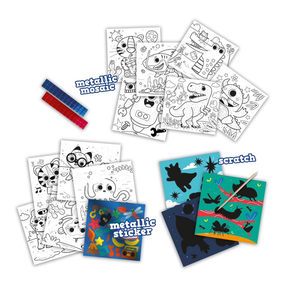 Dieses Set bietet drei verschiedene kreative Aktivitäten: Ausmalen, Mosaike und Aufkleber kleben. Mit dem Doe-Malbuch Metallic 3-in-1 haben Kinder die Möglichkeit, ihre Kreativität auf verschiedene Weise auszudrücken. Die Kombination aus Ausmalen, Diamond Painting und Aufkleber kleben macht es besonders herausfordernd und unterhaltsam. Außerdem fördert es die Entwicklung der Feinmotorik und regt kreatives Denken an.