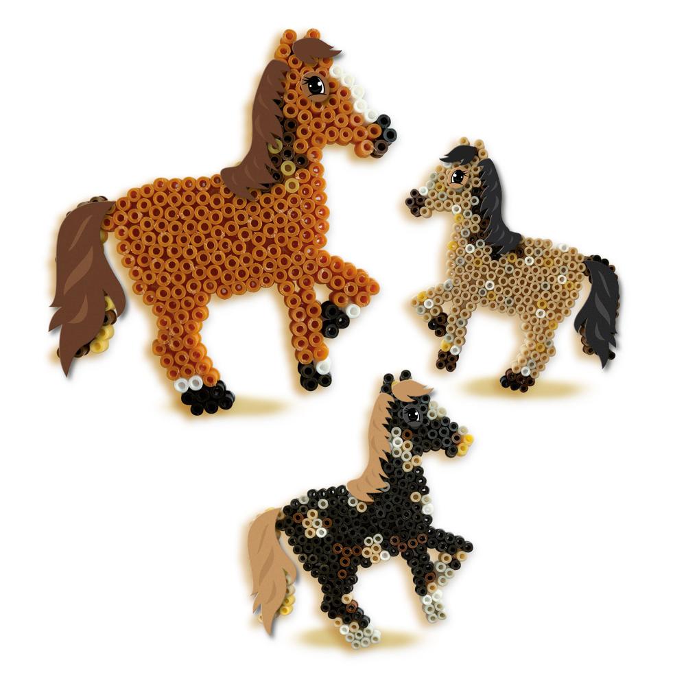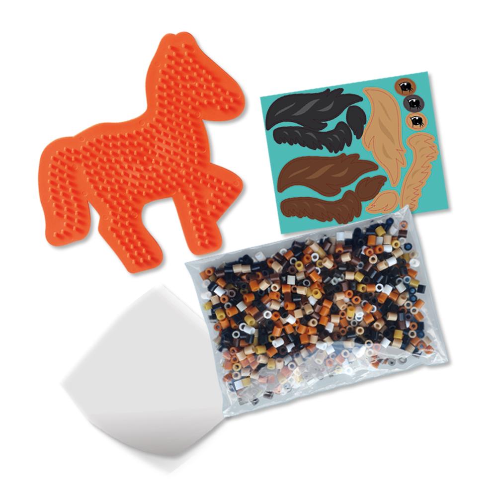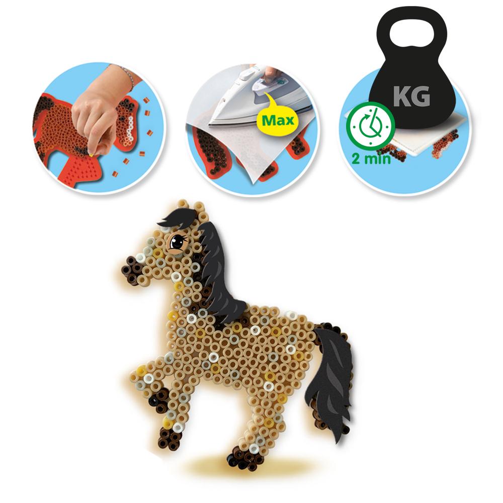 Mit diesem Set von SES Creative können Kinder mit 1200 bunten Bügelperlen einzigartige Pferde herstellen. Dank der pferdeförmigen Platte lassen sich verschiedene Reittiere wie ein Pony, ein Mustang oder ein Haflinger ganz einfach nachbauen. Die mitgelieferten Vorlagen leiten die Kinder Schritt für Schritt an. Sobald die Perlen angeordnet sind, kann ein Erwachsener sie mit dem beigefügten Bügelpapier fixieren. Um den Kreationen eine persönliche Note zu verleihen, werden außerdem Aufkleber mitgeliefert, mit denen Mähne und Augen hinzugefügt werden können. Dieses Handspiel fördert die Feinmotorik, die Geduld und die Vorstellungskraft. Die Kinder können nicht nur hübsche Dekorationen herstellen, sondern auch Geschichten zu ihren Kreationen erfinden. Die Perlen sind PVC-frei und entsprechen den europäischen Sicherheitsstandards (EN-71). Perfekt für Kinder ab 5 Jahren.