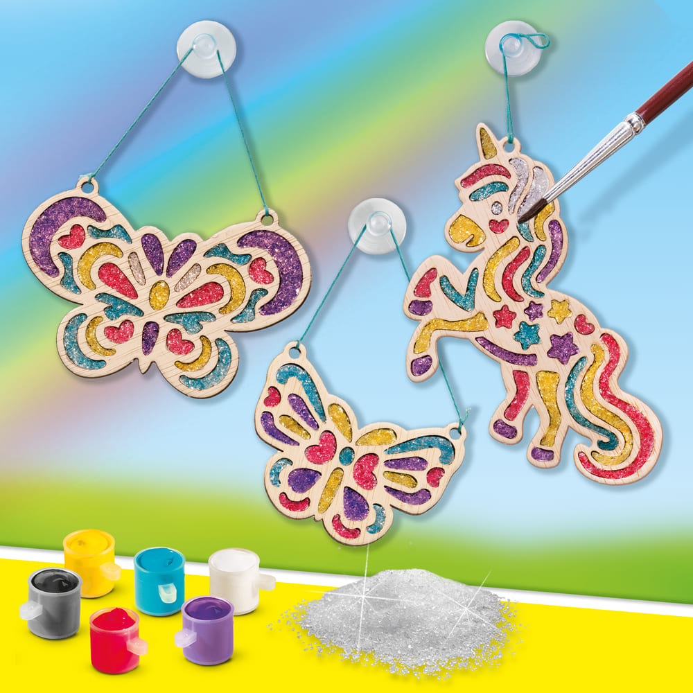 Mit Easy Diamonds – Suncatchers gestalten Kinder ab 6 Jahren wunderschöne Fensterhänger mit Bleiglas-Effekt. Füllen Sie die Holzformen mit Kristallen, geben Sie etwas Wasser hinzu, lassen Sie alles trocknen und bemalen Sie sie anschließend in fröhlichen Farben. Hängen Sie sie ins Fenster und lassen Sie das Sonnenlicht wunderschön hindurchscheinen.