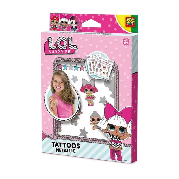 Mit den L.O.L. – Metallic Tattoos von SES Creative verleihst du deinem Look einen zusätzlichen Hauch von Glamour! Diese temporären Tattoos sind mit coolen L.O.L. Surprise-Figuren und einem glänzenden Metallic-Finish versehen. Perfekt für Kinder ab 6 Jahren, die Mode, Glitzer und ihren eigenen Stil lieben.