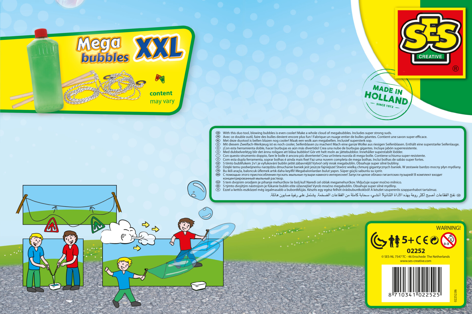 Mit diesem spektakulären Seifenblasenwerkzeug und der starken Seifenlösung von SES macht das Spielen mit Seifenblasen noch viel mehr Spaß. Damit kannst du die größten Seifenblasen machen und gleichzeitig mit mehreren Kindern spielen. Das Werkzeug wurde speziell zur gleichzeitigen Verwendung für zwei Personen entworfen. Und es gibt noch etwas Tolles: du kannst Papierklammern am Werkzeug befestigen und damit gleichzeitig mehrere Seifenblasen machen. So geht’s: Jeder nimmt einen Stiel in die Hand und drückt das Seil in die Seifenlösung. Stellt euch gegenüber und lauft langsam rückwärts – eine Wolke aus riesengroßen Seifenblasen wird zum Himmel fliegen. Schaut wie sie schweben!