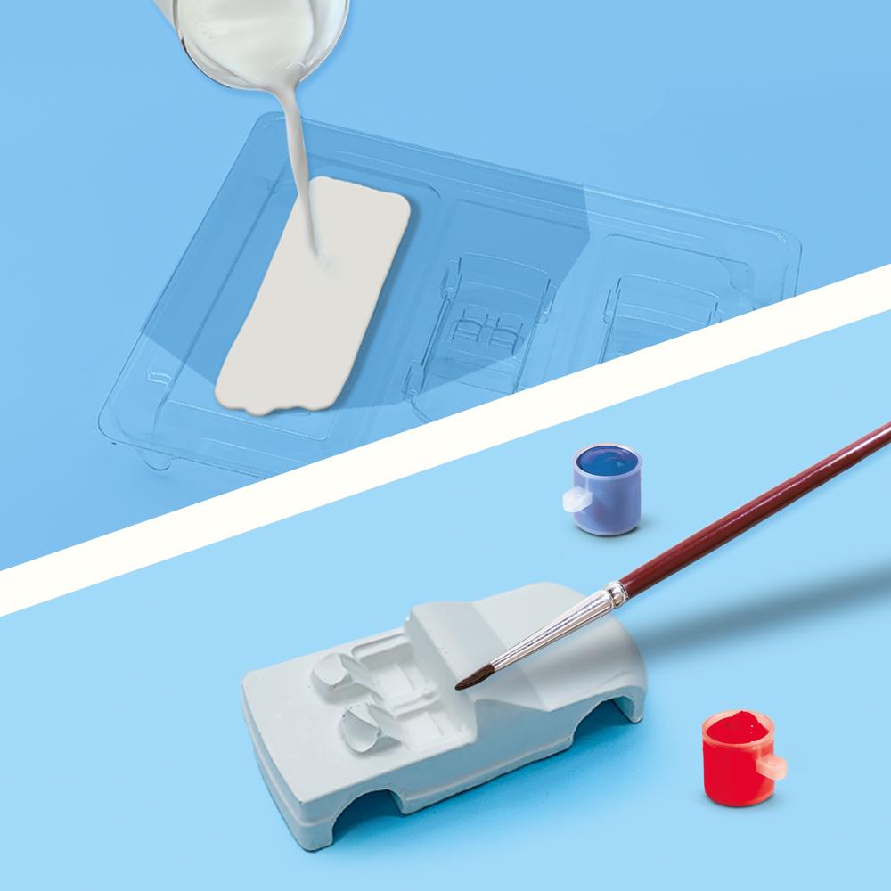Step by step, children make their own racing cars. First, they pour the plaster, then wait for it to harden. Then comes the fun part: painting! From a classic red sports car to a fantasy car with coloured flames. Anything is possible! And as the icing on the cake, you click the wheels underneath and you’re ready to race.