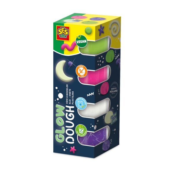 Feel good dough! SES dough in four Glow in the Dark colours. dough that makes you feel good! The dough is completely vegan, gluten-free and super washable. It is bright and soft. And the resealable packaging keeps your dough fresh for longer. Finished with the dough? Scan the QR code on the packaging and discover what else you can do with the packaging! The Feel Good Glow dough comes in the Glow in the Dark colours green, pink, white and purple.
