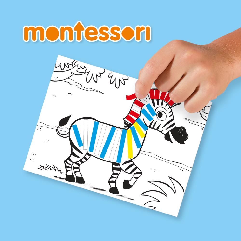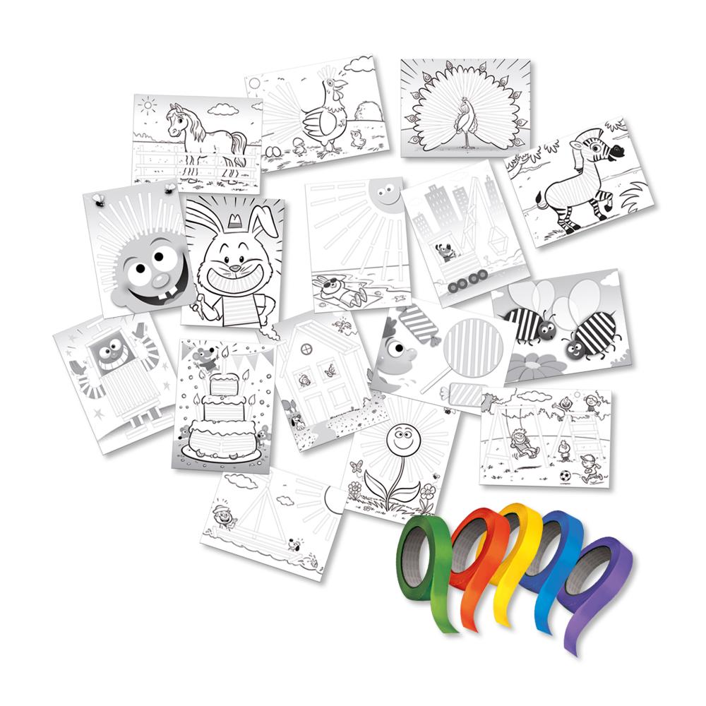 Children choose a card, take a roll of tape and start sticking. Thanks to the clear designs, they can get started independently, while learning how to work neatly in a playful way. This stimulates concentration, creativity and motor development.