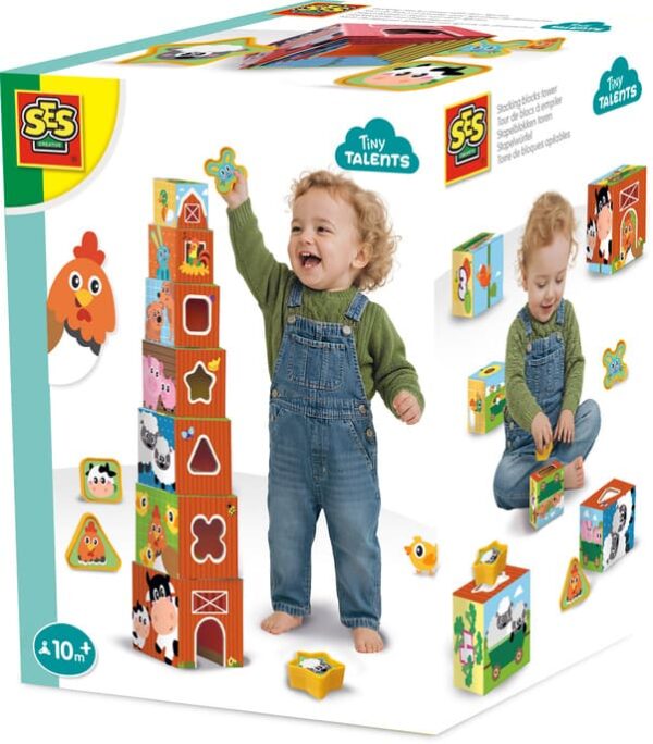 With Stacking blocks tower and shape sorter 2 in 1 – Farm animals from SES Creative, children discover something new every day. A cheerful, educational and safe play experience that grows with their development.