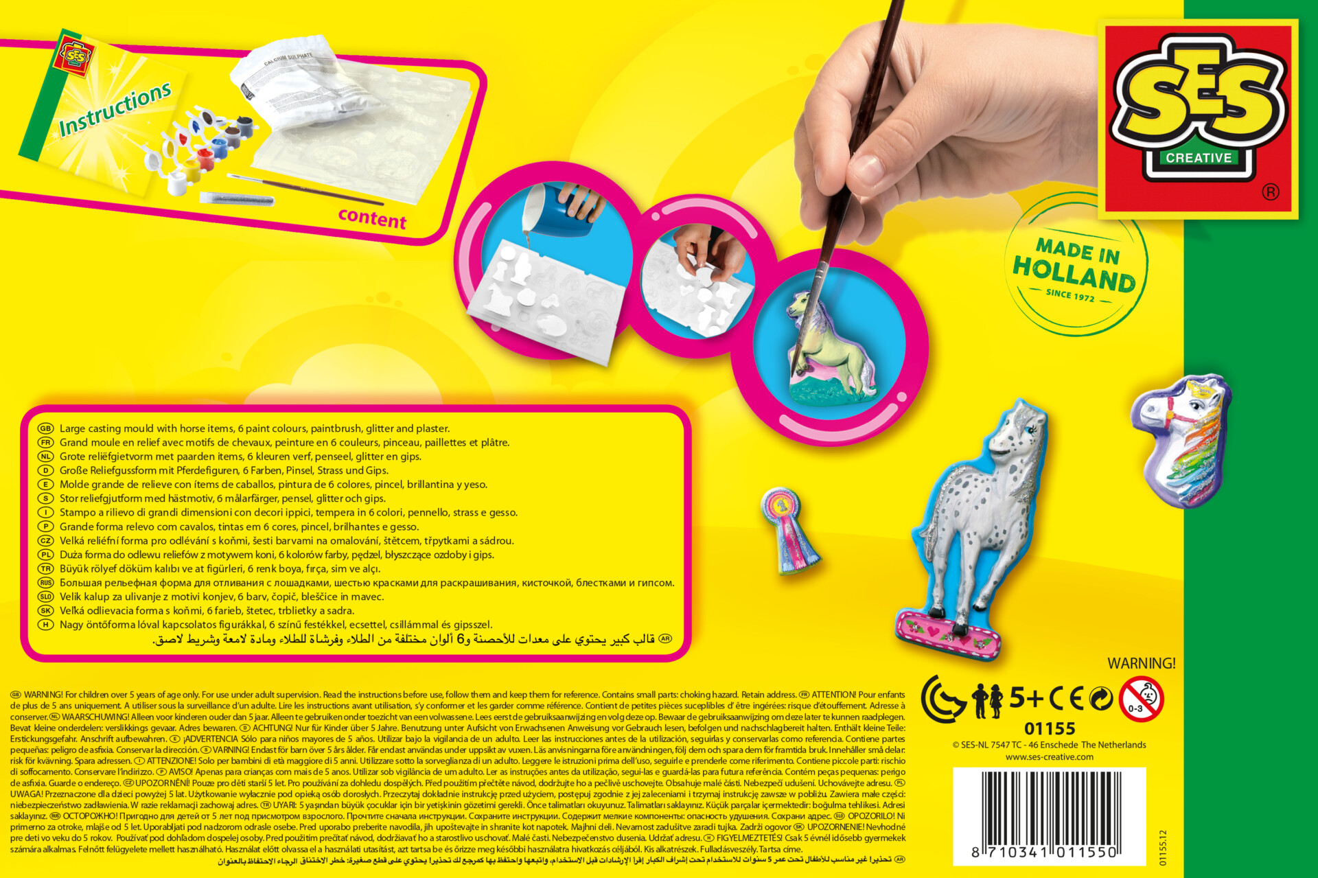 SES presenta una forma fantástica y extraordinaria para que los niños desaten su creatividad. Con este divertido kit fácil de usar, comienza a crear modelos de escayola volcando la mezcla segura en los moldes de plástico. Cuando se hayan endurecido y secado, pinta los modelos como más te guste con los botes incluidos. Es una forma increíble de desarrollar la creatividad, la concentración y las habilidades motrices finas. SES es el especialista en juguetes creativos durante más de 40 años. El desarrollo del niño es un concepto fundamental en el desarrollo de nuestros productos. Como el desarrollo es importante en los primeros años de vida, es esencial que el niño tenga la oportunidad de desarrollar sus talentos y que utilice su creatividad. Además de desarrollar la creatividad, ¡la seguridad y la calidad son los aspectos más importantes de todos nuestros productos! Los productos que desarrollamos son esenciales para las diferentes etapas de desarrollo de cualquier niño.