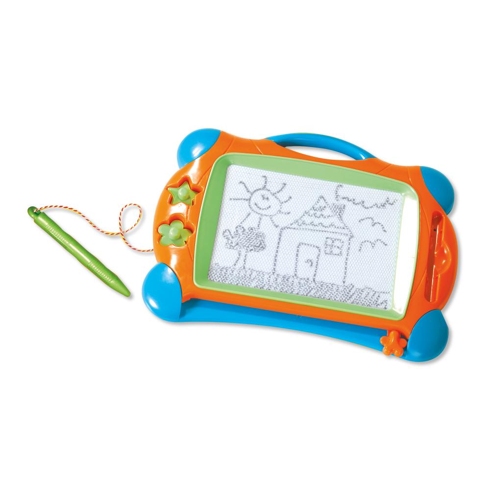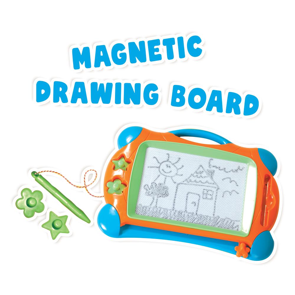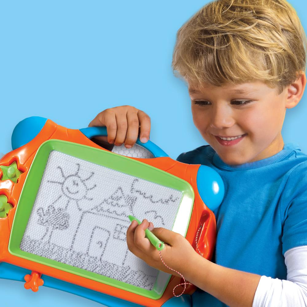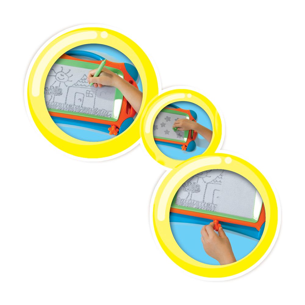Ce tableau à dessin magnétique SES Creative permet aux enfants de 3 à 6 ans de créer librement sans utiliser d’encre ni de papier. L’ardoise est fournie avec un stylo aimanté et deux tampons pour réaliser une grande variété de dessins. Facile à effacer, elle se réutilise sans limite, ce qui la rend adaptée à une utilisation régulière à la maison ou en déplacement. Sa conception légère et compacte permet de l’emporter facilement en voyage ou en sortie. Le jeu stimule la motricité fine, la créativité et la coordination œil-main tout en limitant les salissures. Conforme aux normes de sécurité et neutre en CO2, ce jouet propose une activité manuelle propre et simple, adaptée à l’autonomie des jeunes enfants.