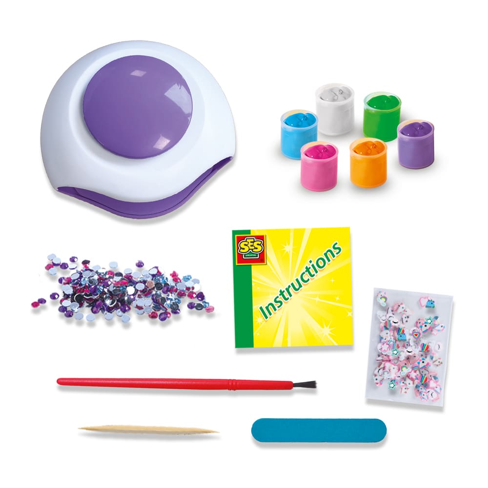 Met de Nail Art Salon van SES Creative creëer je de mooiste nagels helemaal zelf. Lak je nagels in een van de zes vrolijke kleuren, laat ze snel drogen met de speciale nageldroger en versier ze daarna met glinsterende diamantjes of vrolijke unicorn-decoraties. Elke keer ontstaat een unieke look, helemaal in jouw stijl. Laat je fantasie stralen en ontdek hoe leuk het is om je eigen nagelstudio te runnen.