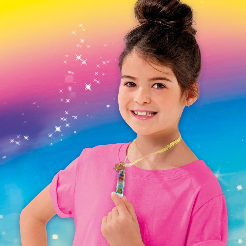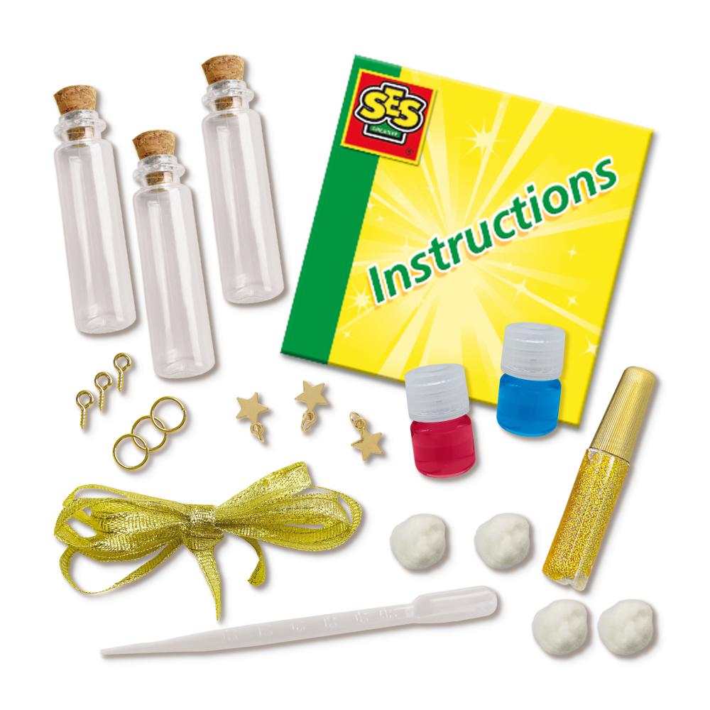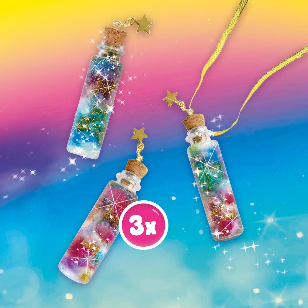 Créez vos propres pendentifs magiques avec le kit de bijoux Galaxy Stardust de SES Creative ! Mélangez des colorants rouges et bleus avec des paillettes dans du coton doux et observez l’effet mystérieux et scintillant qui se produit. Décorez les flacons avec un ruban doré, une breloque en forme d’étoile et fermez-les avec un véritable bouchon en liège. Parfait pour les enfants à partir de 5 ans qui aiment bricoler et créer des bijoux.