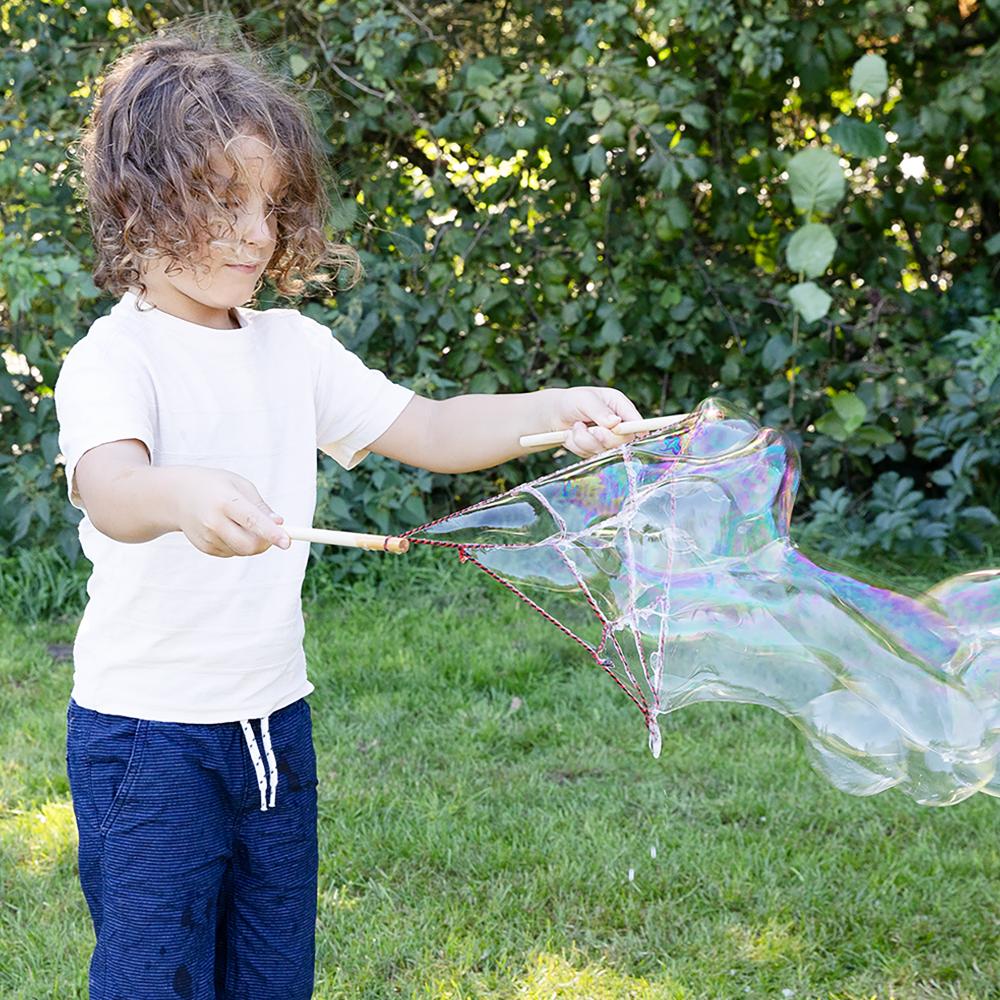 Les enfants peuvent créer d’énormes bulles avec ce kit Mega Bubbles Spider Web. Grâce à la forme spéciale en toile d’araignée et à la solution à bulles ultra puissante, vous pouvez créer en un clin d’œil des bulles géantes qui restent longtemps en suspension dans l’air. Quelle taille pouvez-vous leur donner avant qu’elles n’éclatent ?