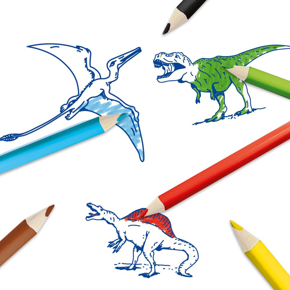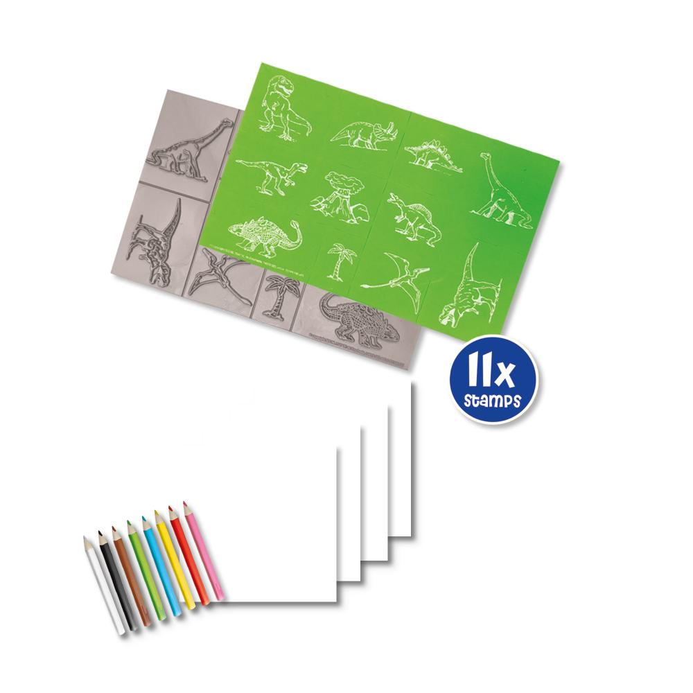 Créez vos propres scènes préhistoriques à l’aide de tampons et de couleurs.