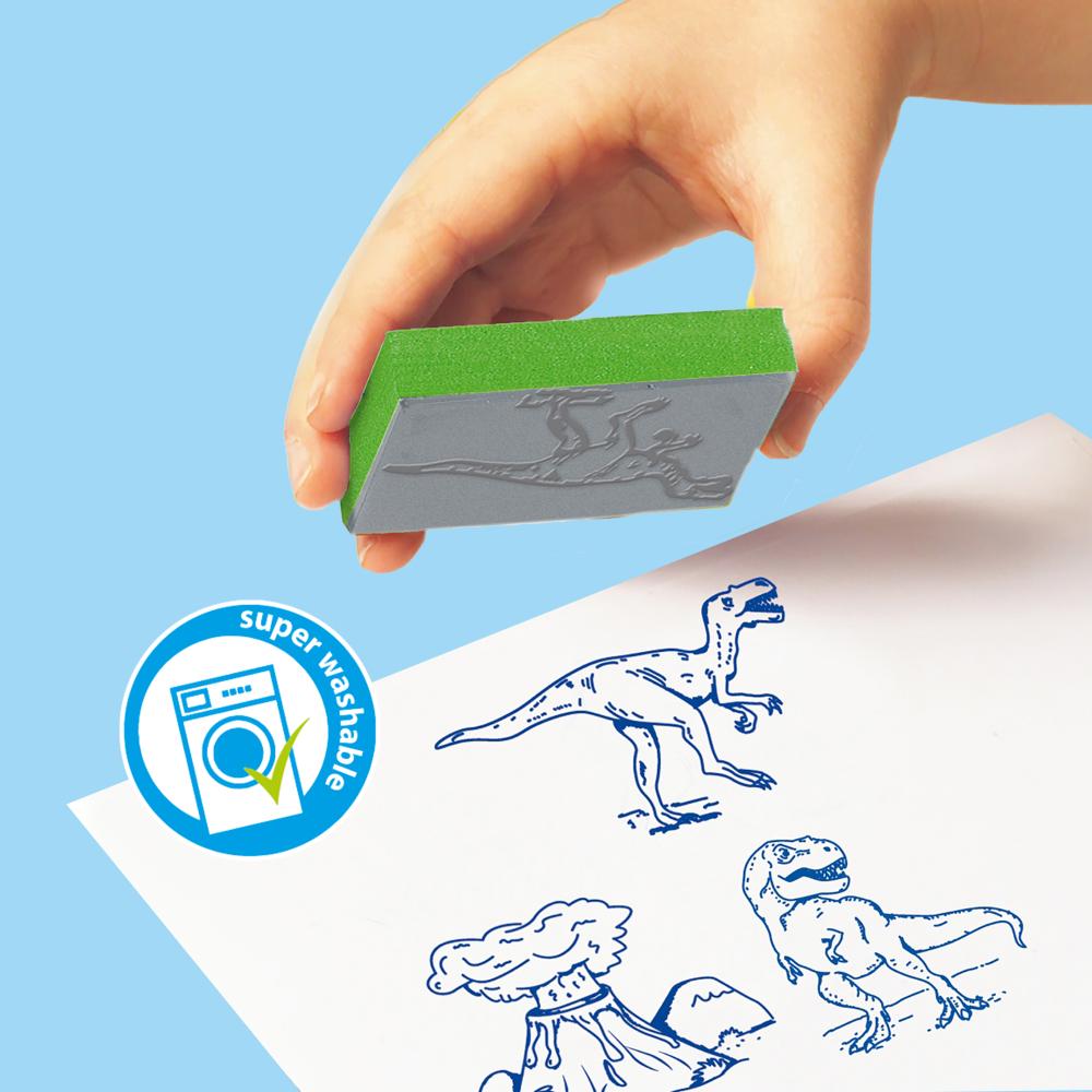 Avec le set de tampons Dino de SES Creative, les enfants peuvent créer leur propre monde de dinosaures à l’aide de tampons en mousse et d’un tampon encreur coloré.