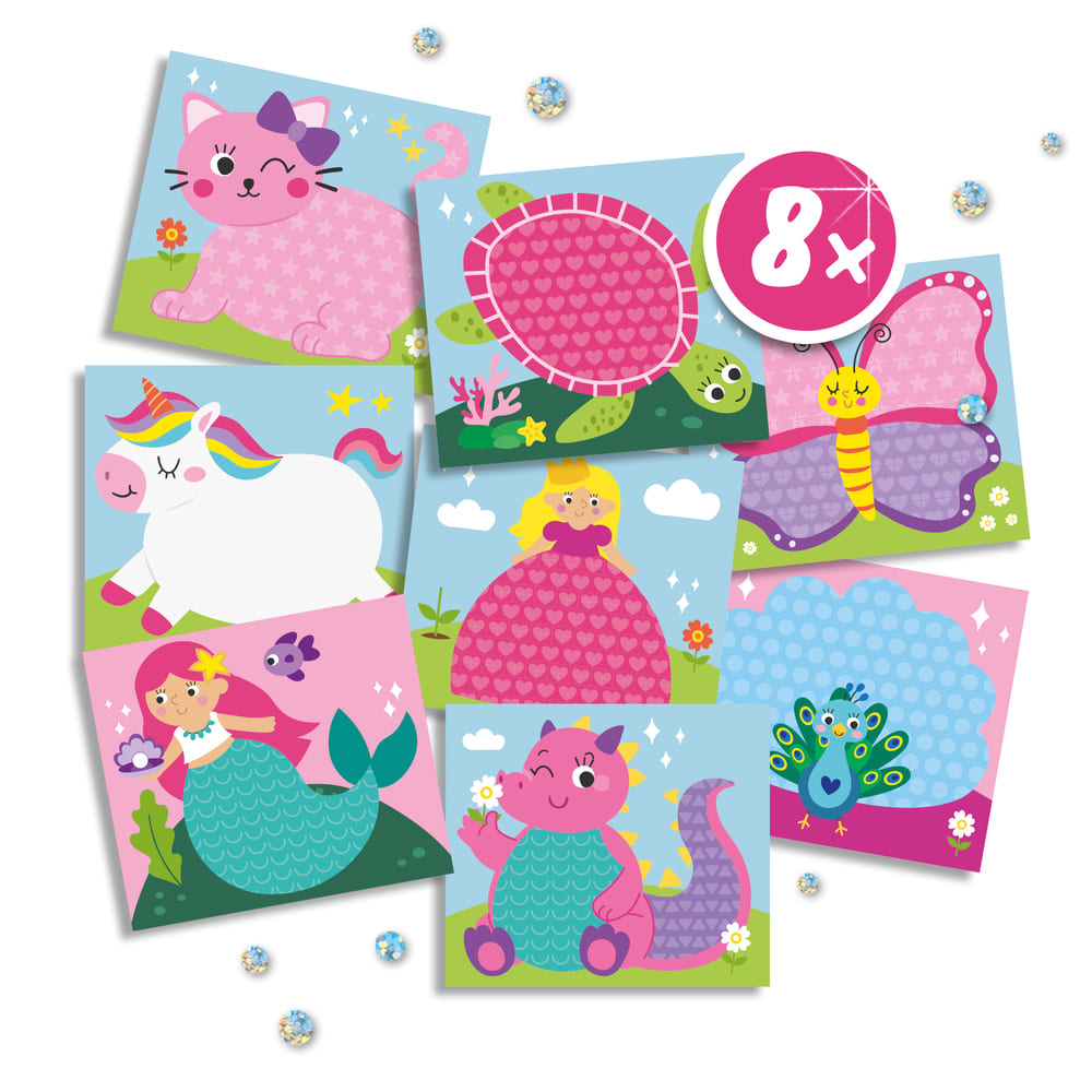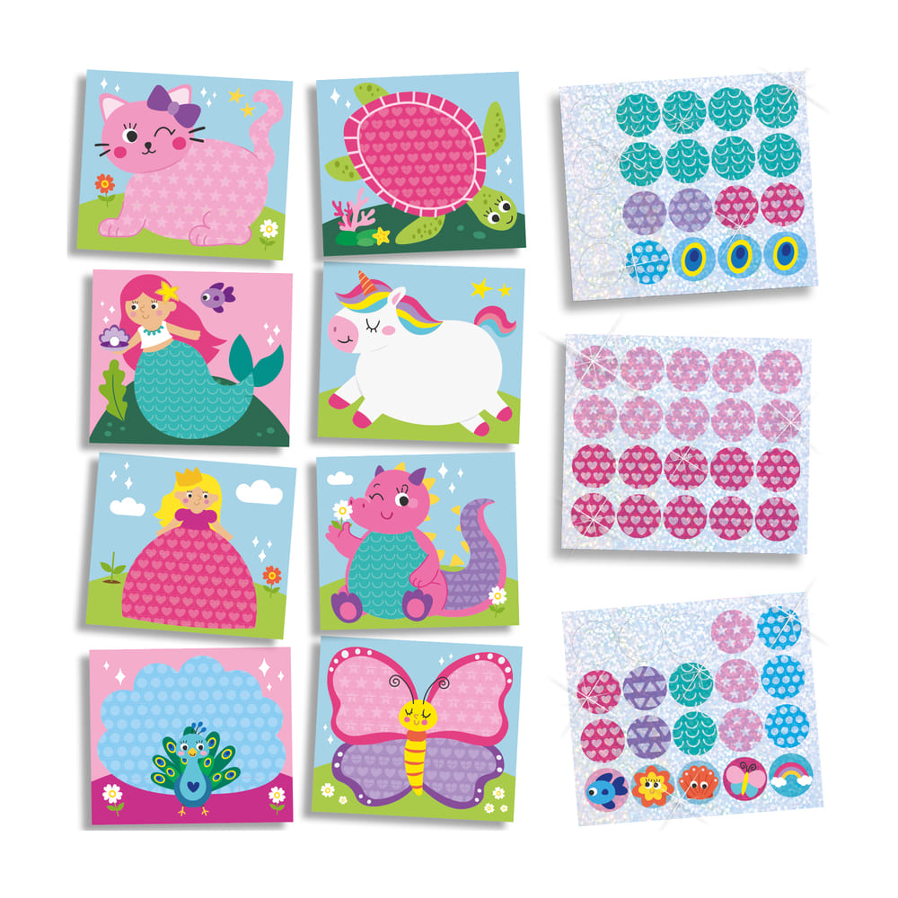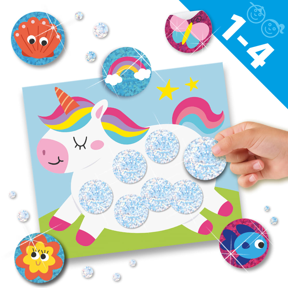 Mit diesem fröhlichen Set entdecken Kinder ab 1 Jahr, wie viel Spaß Kleben machen kann. Die großen, sicheren Glitzer-Sticker sind leicht zu greifen und auf die bunten Illustrationen zu platzieren. So dekorieren sie die Karten ganz allein und gestalten einzigartige, funkelnde Kunstwerke.