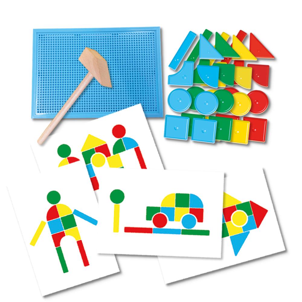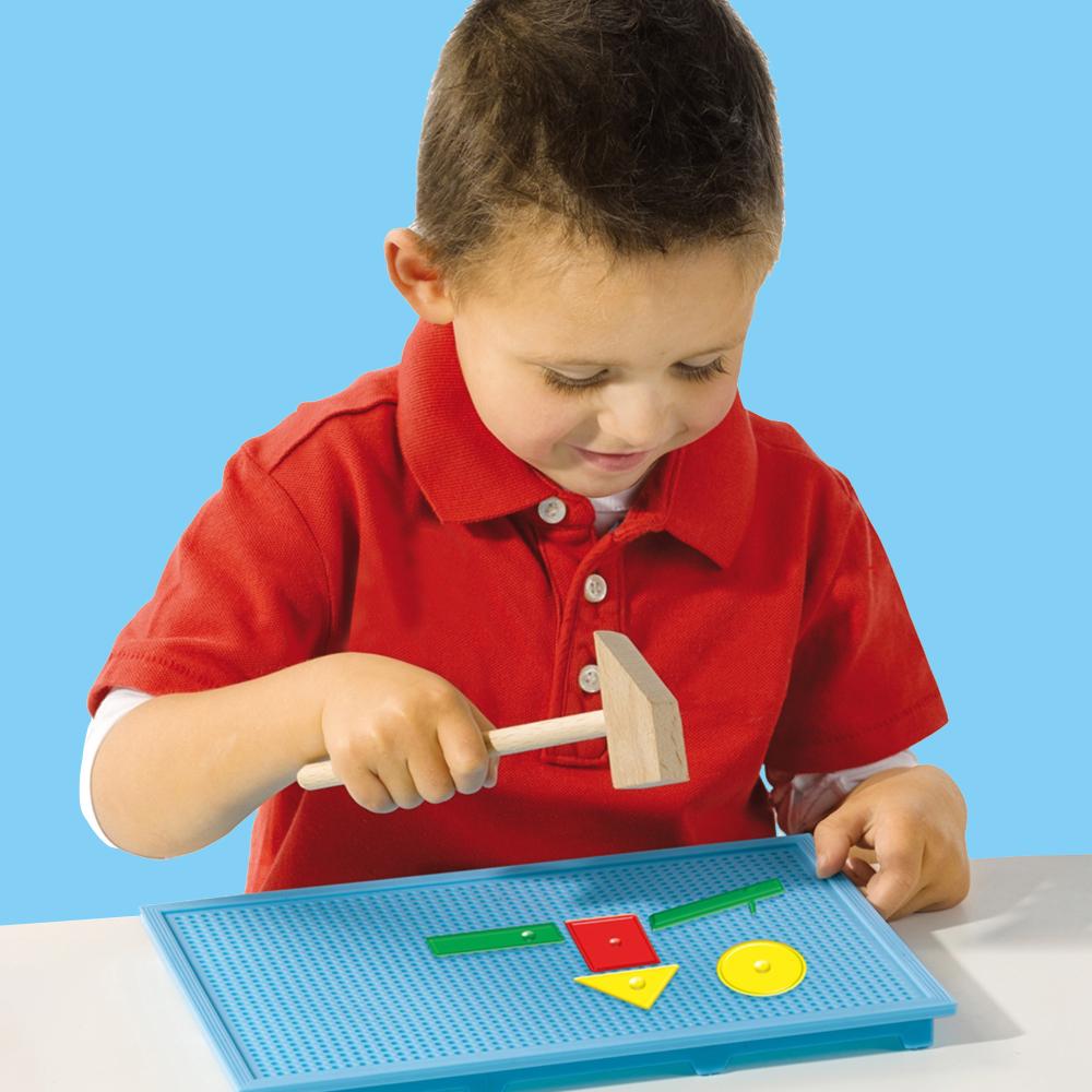 – Stimule la motricité fine et la coordination œil-main en martelant les moules au bon endroit