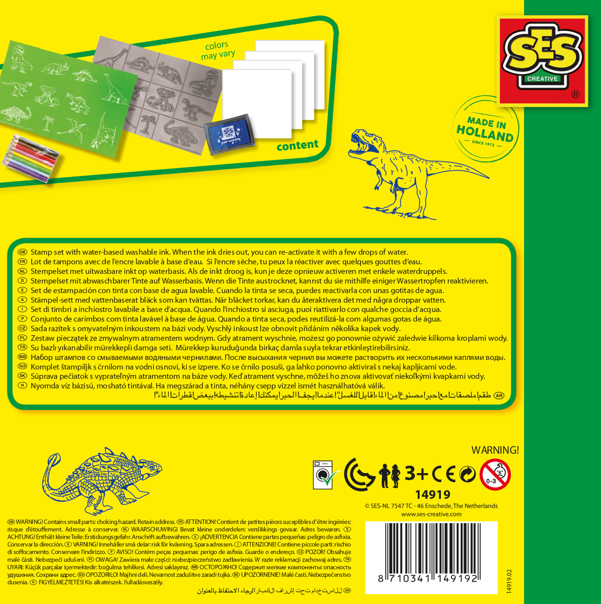 Un kit de tampons SES amusant sur le thème des dinosaures. Avec les 11 tampons différents et l’encre à base d’eau, tu peux réaliser les plus beaux dessins. Colorie les dinosaures avec les crayons de couleur fournis. L’encre a séché ? Tu peux y remédier avec quelques gouttes d’eau.