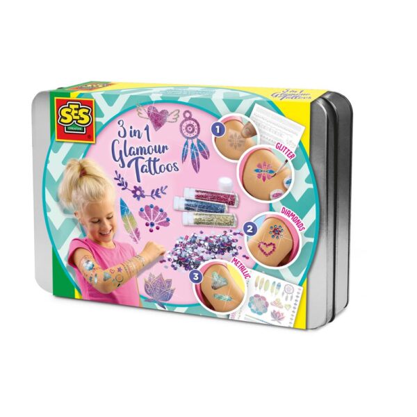 Ontdek hoe leuk het is om jouw stijl te laten schitteren! Met de 3-in-1 Glamour Tattoos set van SES Creative maak je unieke looks die passen bij elk moment. Tijd om te glinsteren!