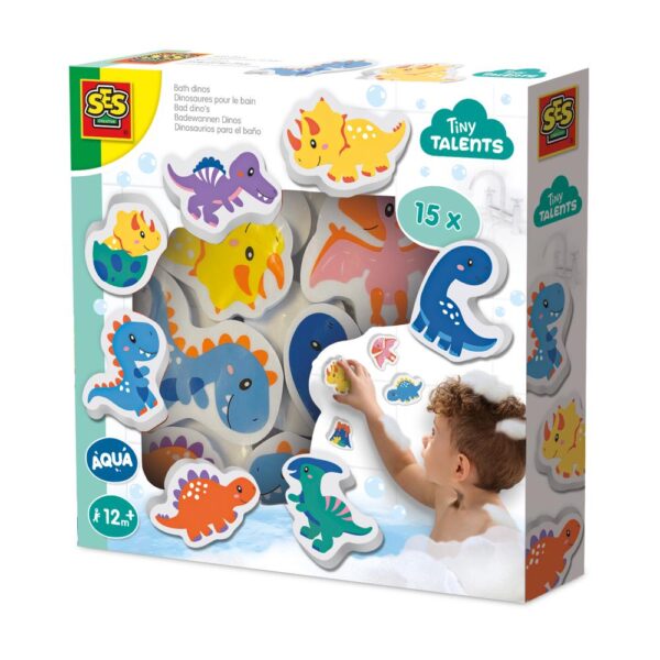 Brulend veel badplezier met de Bad Dino’s Set van SES Creative! Deze set bevat 15 kleurrijke foam dino’s die blijven plakken aan natte oppervlakken, zoals de badrand of tegels. Zo kan je kleintje eindeloos dino-avonturen bedenken tijdens het badderen. De vrolijke kleuren en veilige materialen maken het speelgoed ideaal voor interactief en fantasierijk speelplezier in bad.