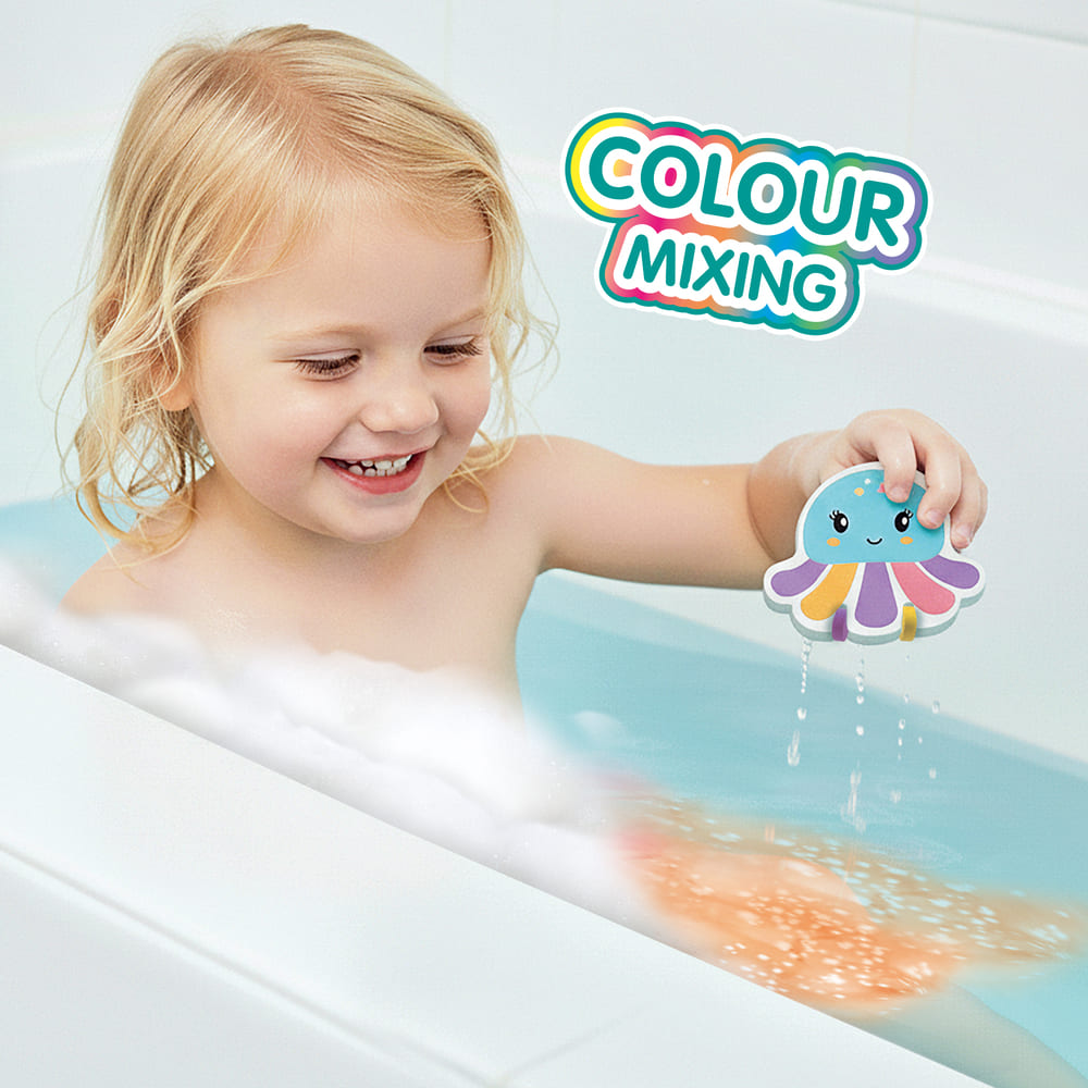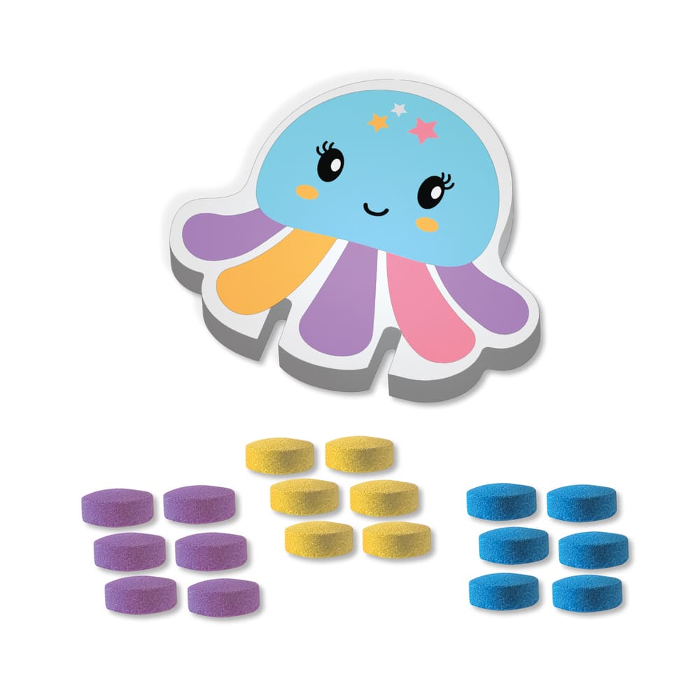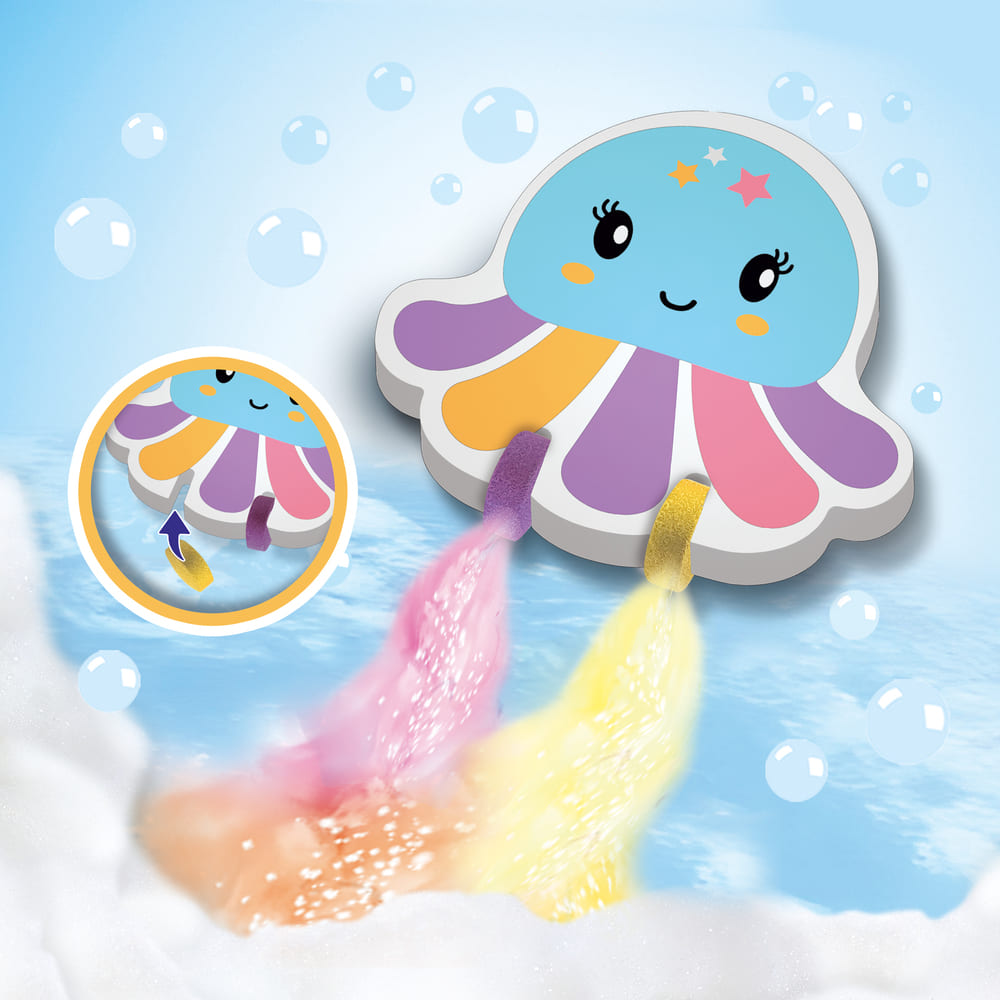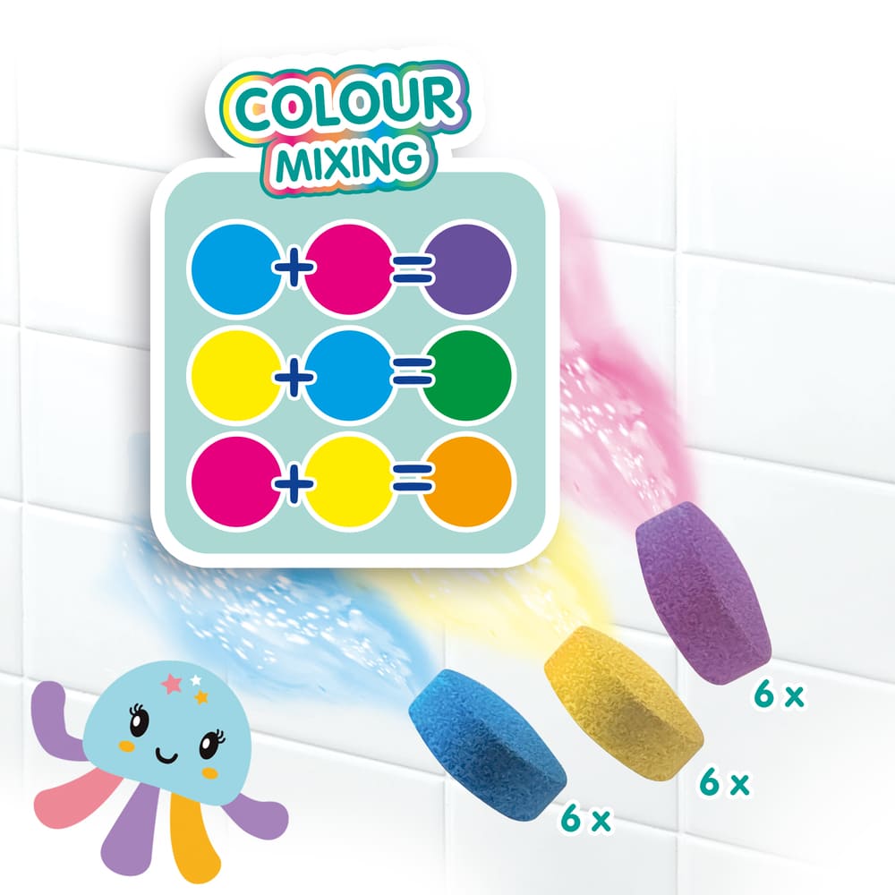 Beweeg de inktvis door het water en laat een betoverend kleurenspoor achter. De tabletten lossen gemakkelijk op en zijn volledig veilig voor huid, haar en bad. Zo wordt elk badmoment een vrolijk, leerzaam en zorgeloos spetterfeest.