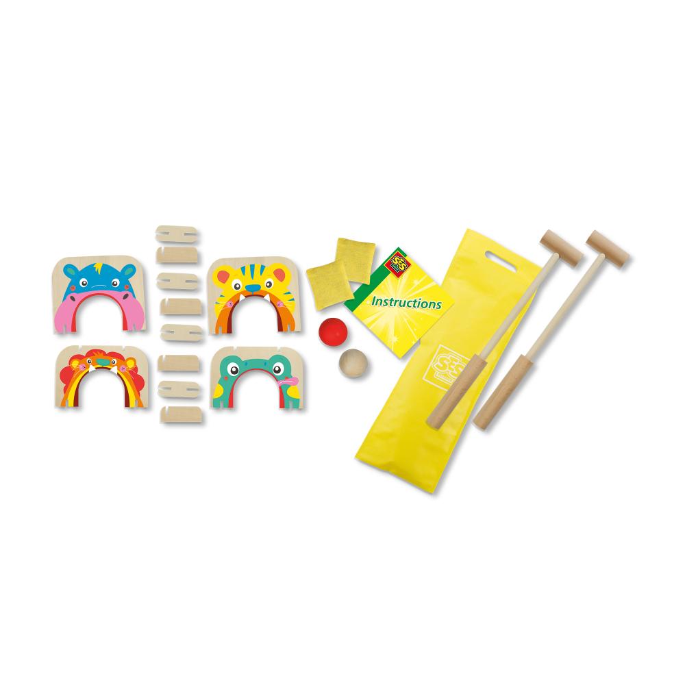 Zet de halve poortjes neer en probeer de bal met behulp van de croquetstick door alle poortjes te slaan. Klaar met croquet? Koppel eenvoudig twee poortjes aan elkaar om een doel te maken voor het pittenzak gooien. Met de handige bewaartas neem je het spel overal mee naartoe!
