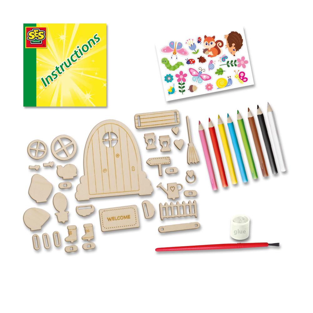Monteer de houten deur en accessoires eenvoudig met de bijgeleverde lijm. Versier daarna je feeëndeurtje met kleurpotloden en stickers. Zo ontstaat er een magische poort die uitnodigt tot eindeloze verhalen en spel.
