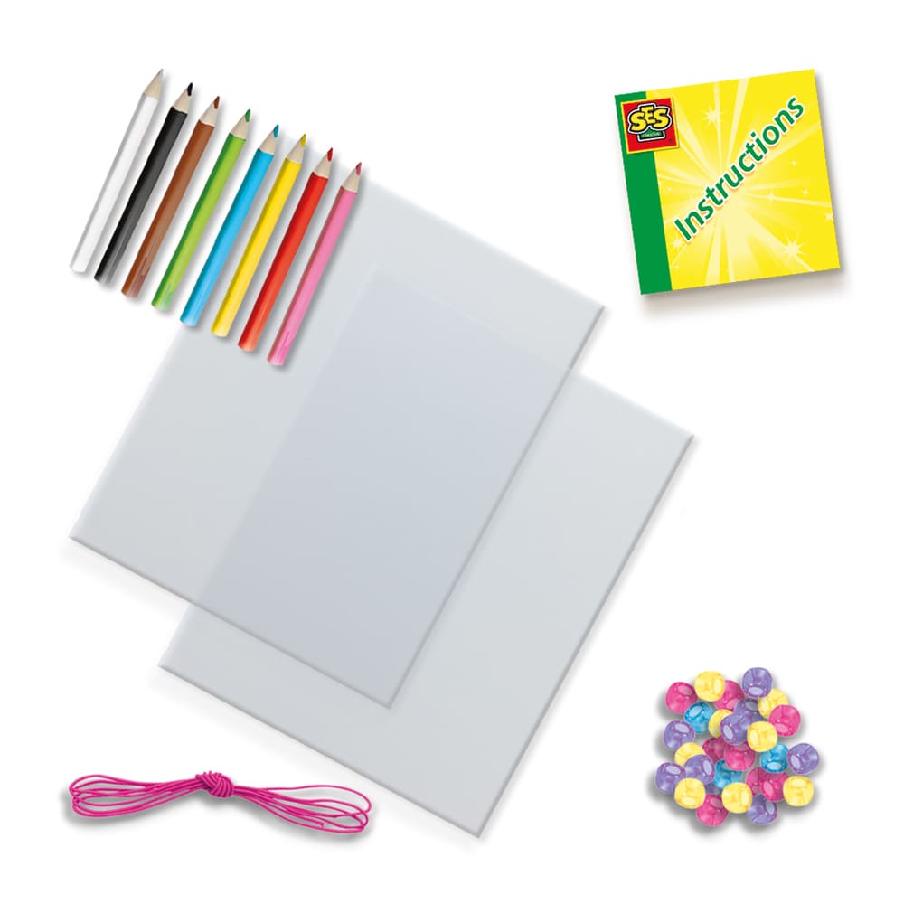 Met de Hobby Pink – Fashion Girls Bedelarmbanden set van SES Creative maak je zelf unieke bedels en vrolijke armbanden. Gebruik de magische krimpfolie om jouw ontwerp 7x kleiner en 7x dikker te maken in de oven. Versier de bedels met de meegeleverde kleurpotloden, rijg ze aan het elastiekkoord met kleurrijke kralen en ontwerp armbanden die helemaal bij jou passen.