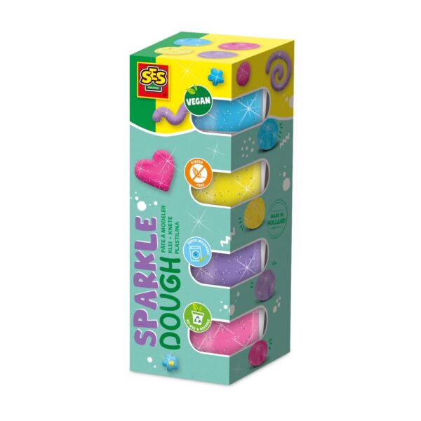 Feel good klei! De SES-klei in vier glitter kleuren. Klei die je een goed gevoel geeft! De klei is volledig vegan, glutenvrij en super uitwasbaar. Het is helder en zacht. En de hersluitbare verpakking houdt je klei langer goed. Klaar met de klei? Scan de QR-code op de verpakking en ontdek wat je allemaal nog kunt doen met de verpakking! De Feel good Sparkle klei bestaat uit de glitter kleuren blauw, geel, paars en roze.