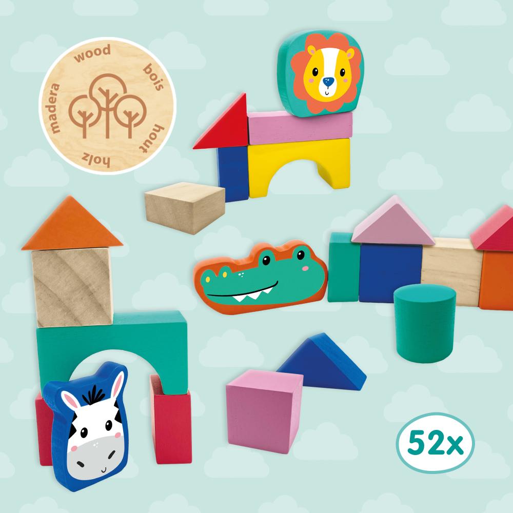 Deze set van SES Creative bevat 52 houten bouwblokken in prachtige, moderne kleuren. Kinderen vanaf 1 jaar kunnen genieten van het stapelen van de blokken en het bouwen van torens, huizen en andere structuren. Dit speelgoed ontwikkelt ruimtelijk inzicht en motorische vaardigheden door middel van spel. Met de drie dierenkoppen kunnen dieren gestapeld worden voor eindeloos speelplezier. Als ze klaar zijn met spelen, kunnen kinderen de blokken eenvoudig opbergen in de handige bewaartas.
