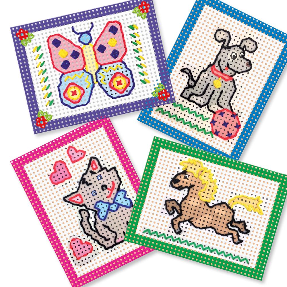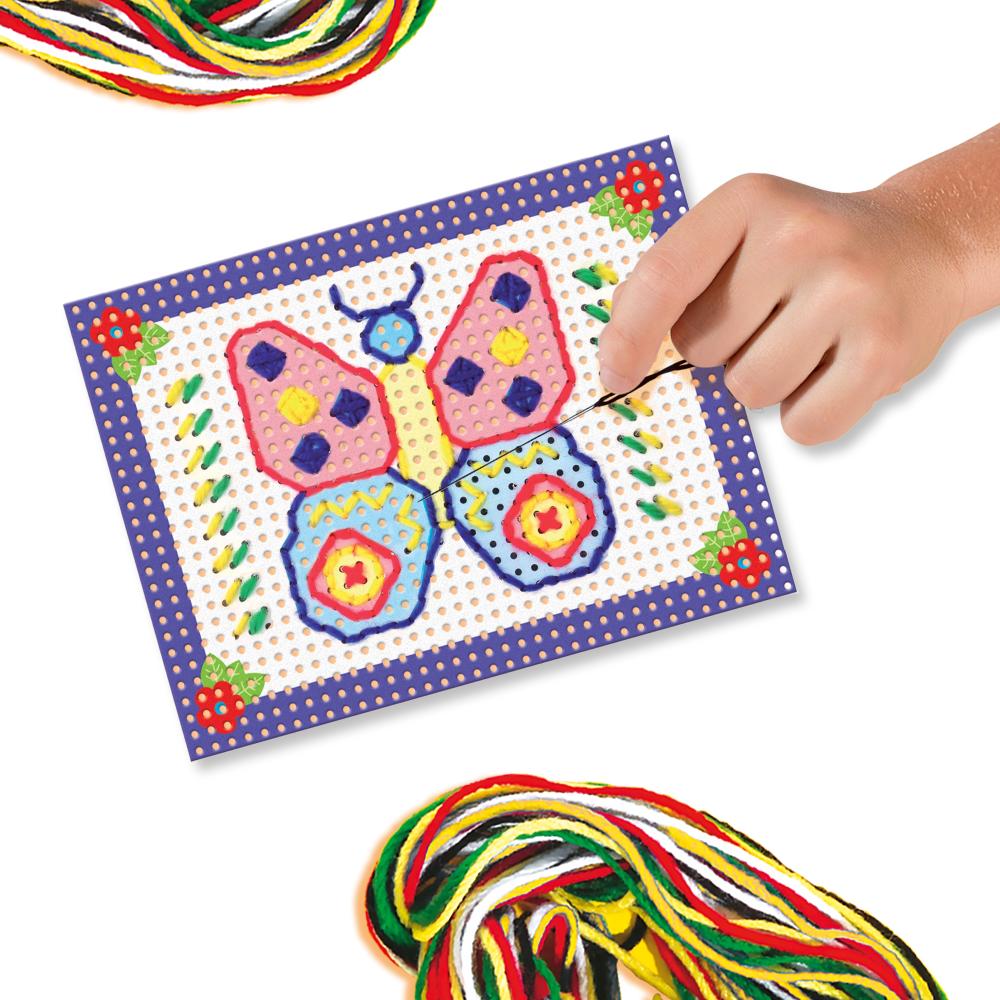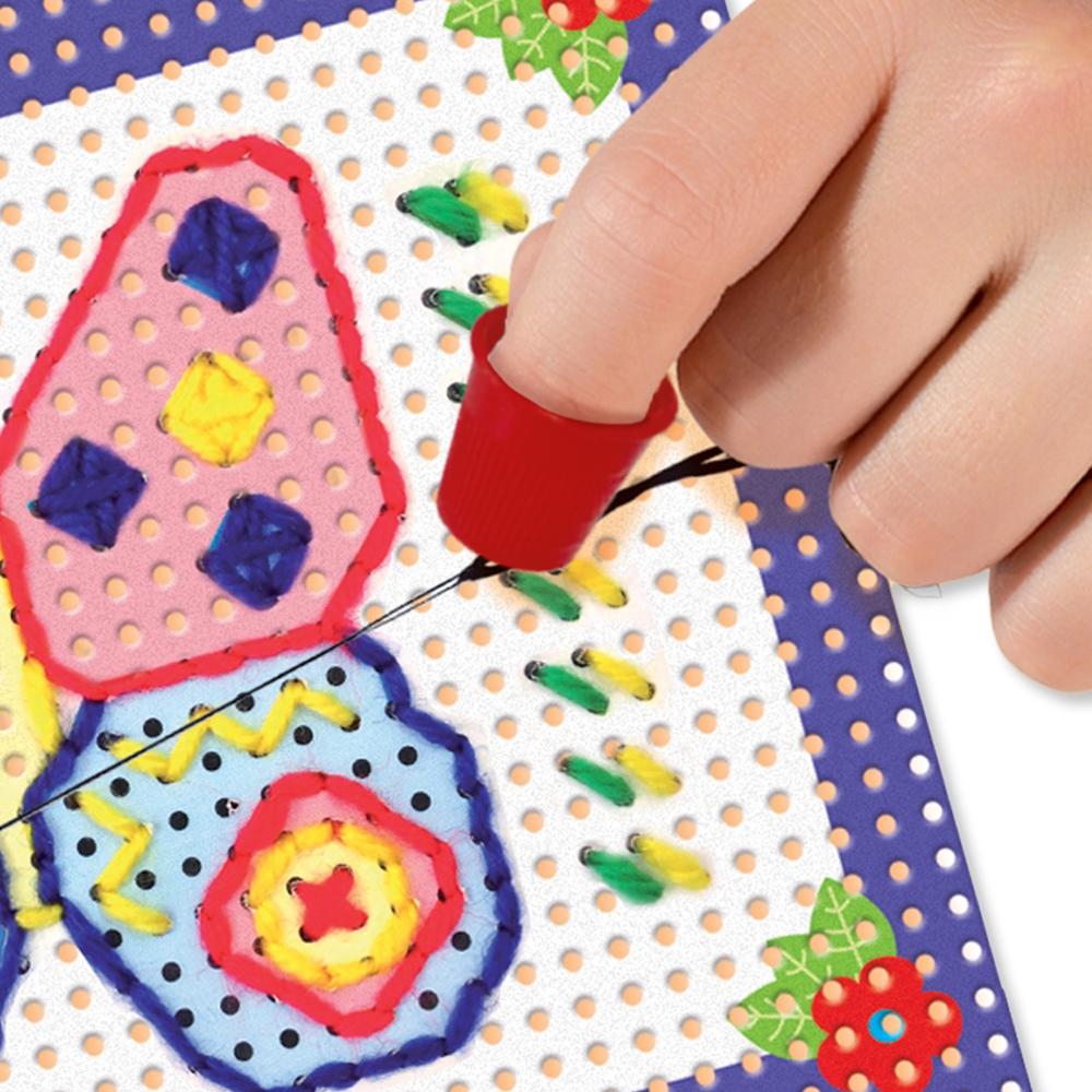 Dankzij de geperforeerde kaarten en de kunststof naald leren kinderen eenvoudig de basis van het borduren. Het stevige materiaal en de dikke wol maken de activiteit veilig en overzichtelijk, zodat kinderen al snel mooie patronen kunnen maken. Zo groeit hun zelfvertrouwen terwijl ze hun eigen borduurkunstwerkjes creëren.