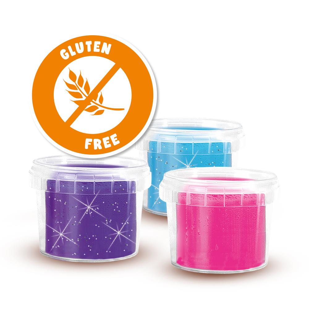 – Klei in 3 verschillende neon kleuren: glitter paars, glitter blauw en roze