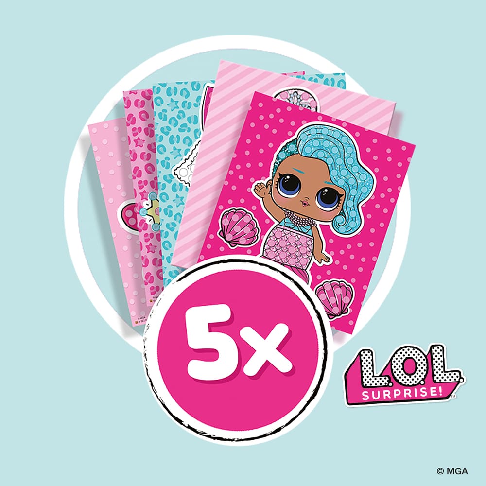 5 kleurrijke mozaïekkaarten met L.O.L. Surprise-thema
