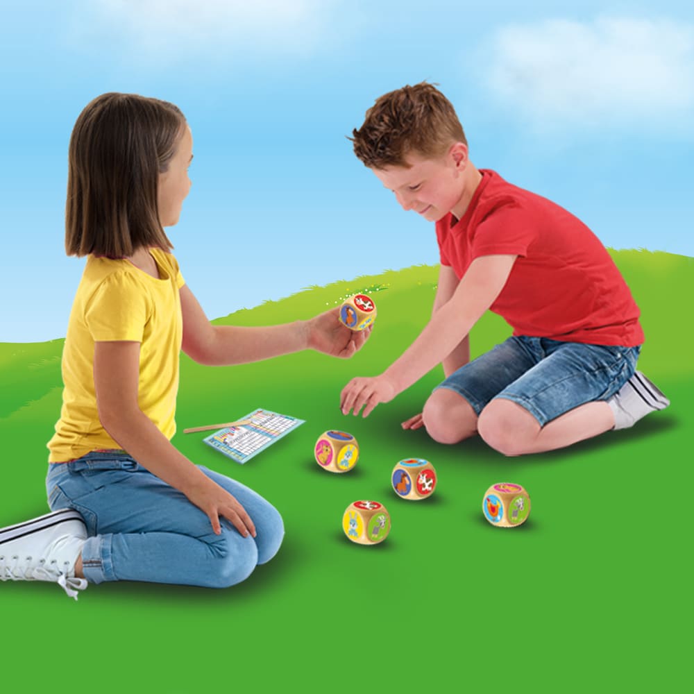 – Met grote houten dobbelstenen