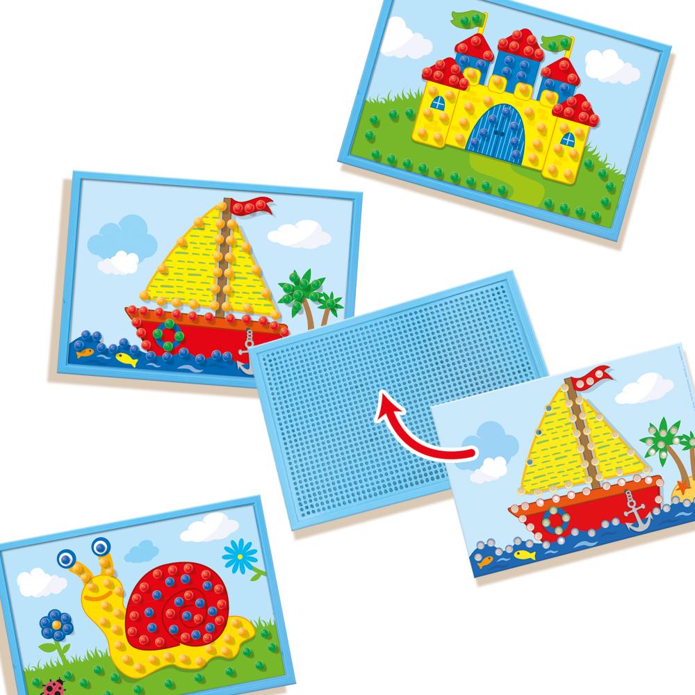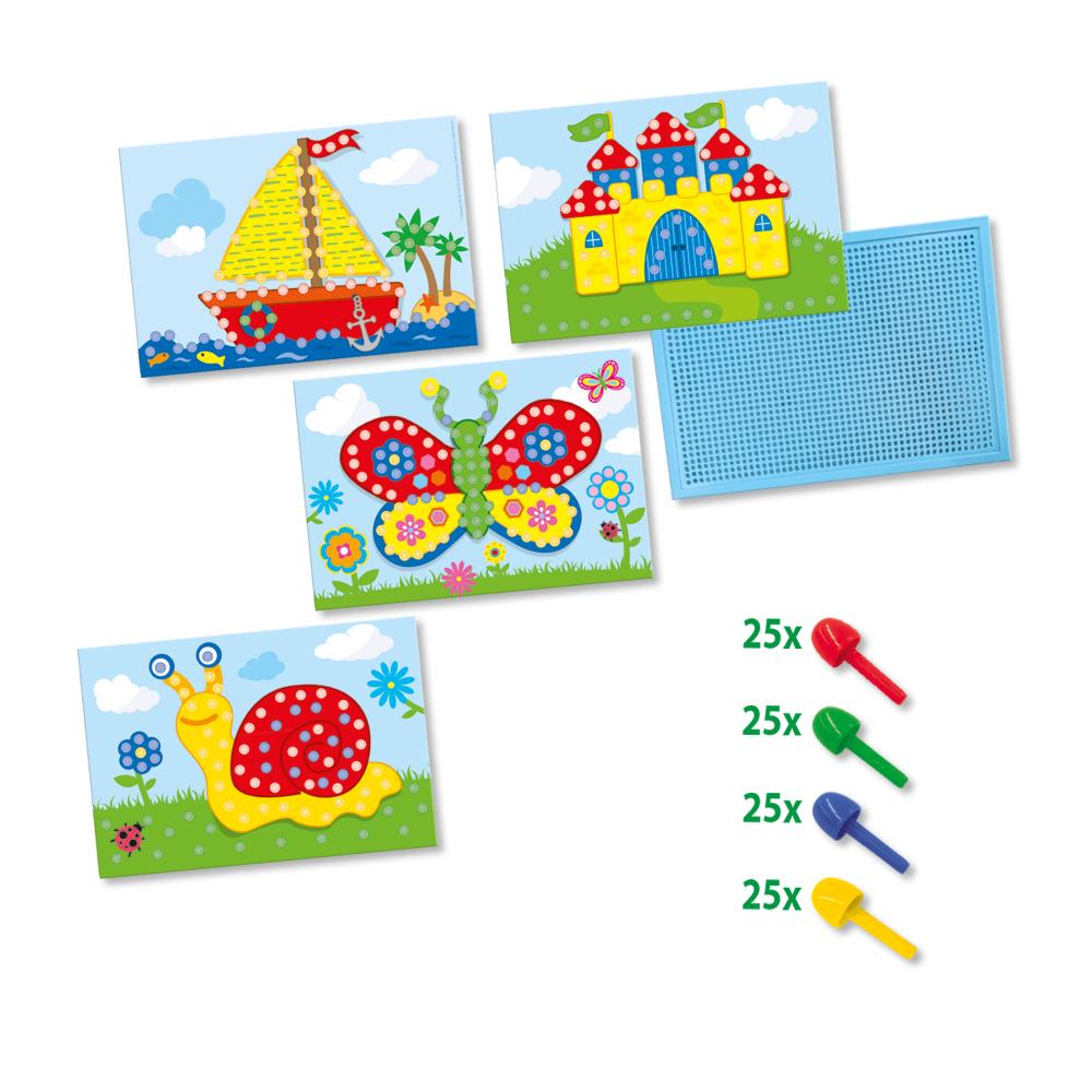 Met dit mozaïekbord kunnen kinderen eindeloos variëren en hun eigen ontwerpen maken met 100 gekleurde pinnen en 4 geprinte kaarten.