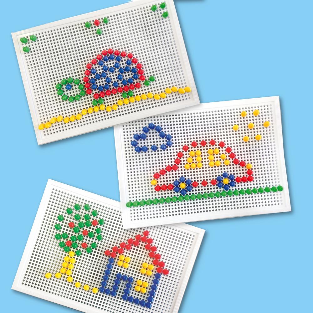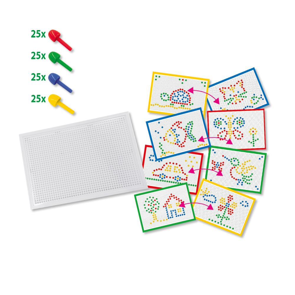 Steek de pinnen in het bord en volg de voorbeelden of bedenk je eigen ontwerpen. Ontdek eindeloos creatief plezier met dit mozaïekbord!