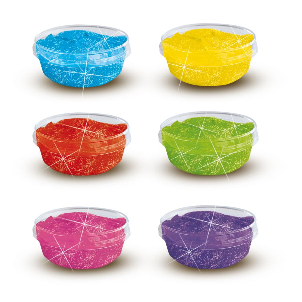 – 6 verschillende kleuren glitterverf in bakjes van 45 ml