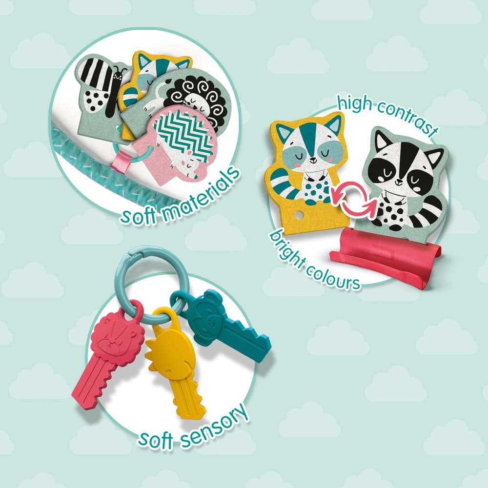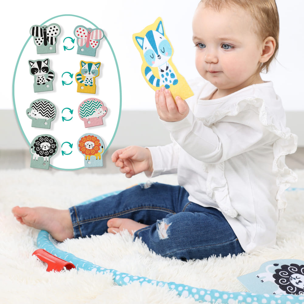 Laat je baby de verschillende delen van de ring ontdekken door te voelen en vast te houden. De zachte stoffen en contrasterende afbeeldingen maken de activiteit extra boeiend. Perfect voor gebruik tijdens speel- of rustmomenten!