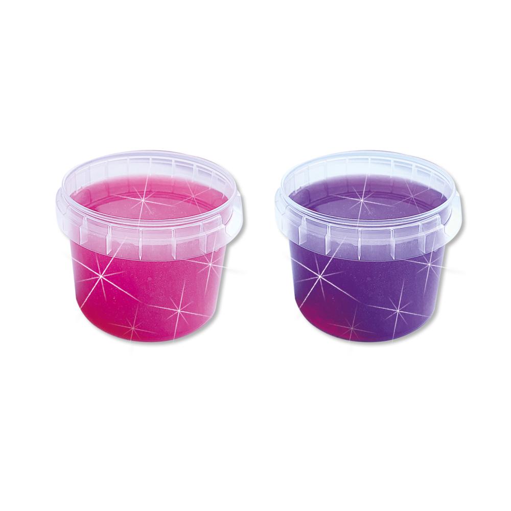 – Deze set bevat twee verschillende kleuren slijm: roze en paars