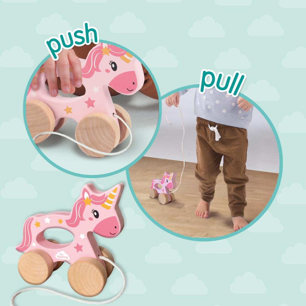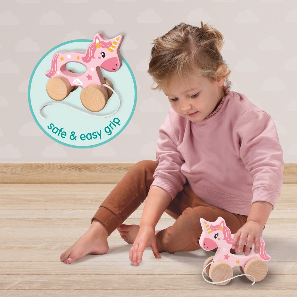 Deze prachtige roze unicorn is niet zomaar een speelgoed, het is een magisch trekdier dat je overal mee naartoe kunt nemen! Met stevige wielen en een stevig houten ontwerp is deze unicorn perfect voor kleine avonturiers. Trek de unicorn voort of gebruik hem als duwdier terwijl je kleintje zich ontwikkelt en plezier maakt.