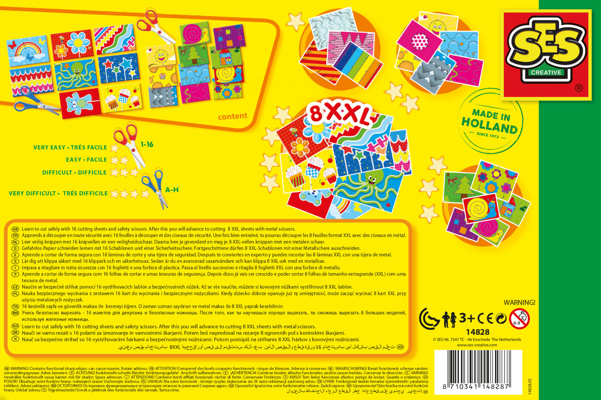 De grote verpakking ik leer knippen is een erg leerzaam product. Je leert om te gaan met een schaar. De eerste 16 vellen met verschillende vormen knip je met een veilige kinderschaar. Deze schaar knipt alleen papier. Je begint eerst met een rechte lijn. Stap voor stap leer je zigzag, golven en cirkels te knippen. Na 16 vellen krijg je 8 XXL kaarten. Nu ben je ervaren genoeg om met de metalen schaar aan de slag te gaan. Leer stap voor stap op een leuke en veilige manier de schaar te gebruiken!