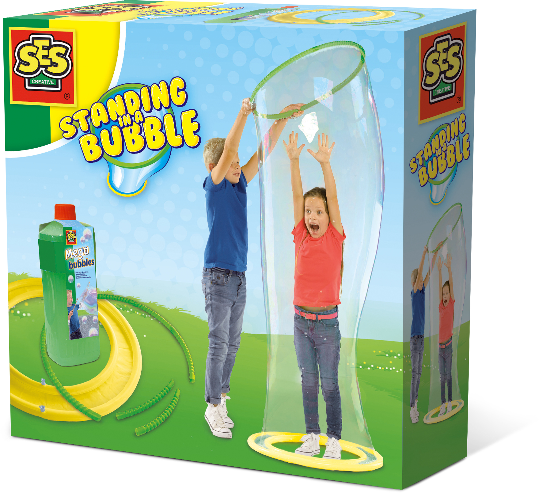 Wat is er nog leuker dan met bellen spelen? Met mega bellen spelen! Blaas het zeepbadje op en vul deze met het sop. Zet de onderdelen van de bubble ring in elkaar zodat er een grote hoepel ontstaat. Door de speciaal ontwikkelde supersterke zeepoplossing kan je de bel zo groot maken dat je er zelf helemaal in kan staan.