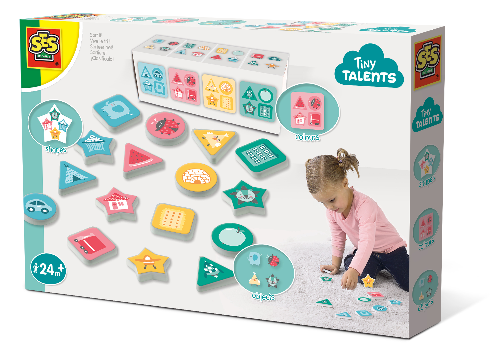 Sorteer het! Een leuke set voor jonge kinderen voor het leren van kleuren, vormen en objecten. Zoek alle rode, blauwe, groene of gele speelschijven bij elkaar. Gelukt? Probeer dan de gelijke vormen bij elkaar te zoeken of maak een kwartet met gelijke thema’s. Zo sorteer je alle gebouwen, etenswaren, dieren of voertuigen. Een spel dat continue opnieuw gespeeld kan worden en waarbij jonge kinderen steeds opnieuw uitgedaagd en beloont worden. De speelschijven kunnen opgeborgen worden in de meegeleverde bewaarverpakking, die tevens dient als instructie. Leuk om als ouder samen met je kind of kinderen te doen.