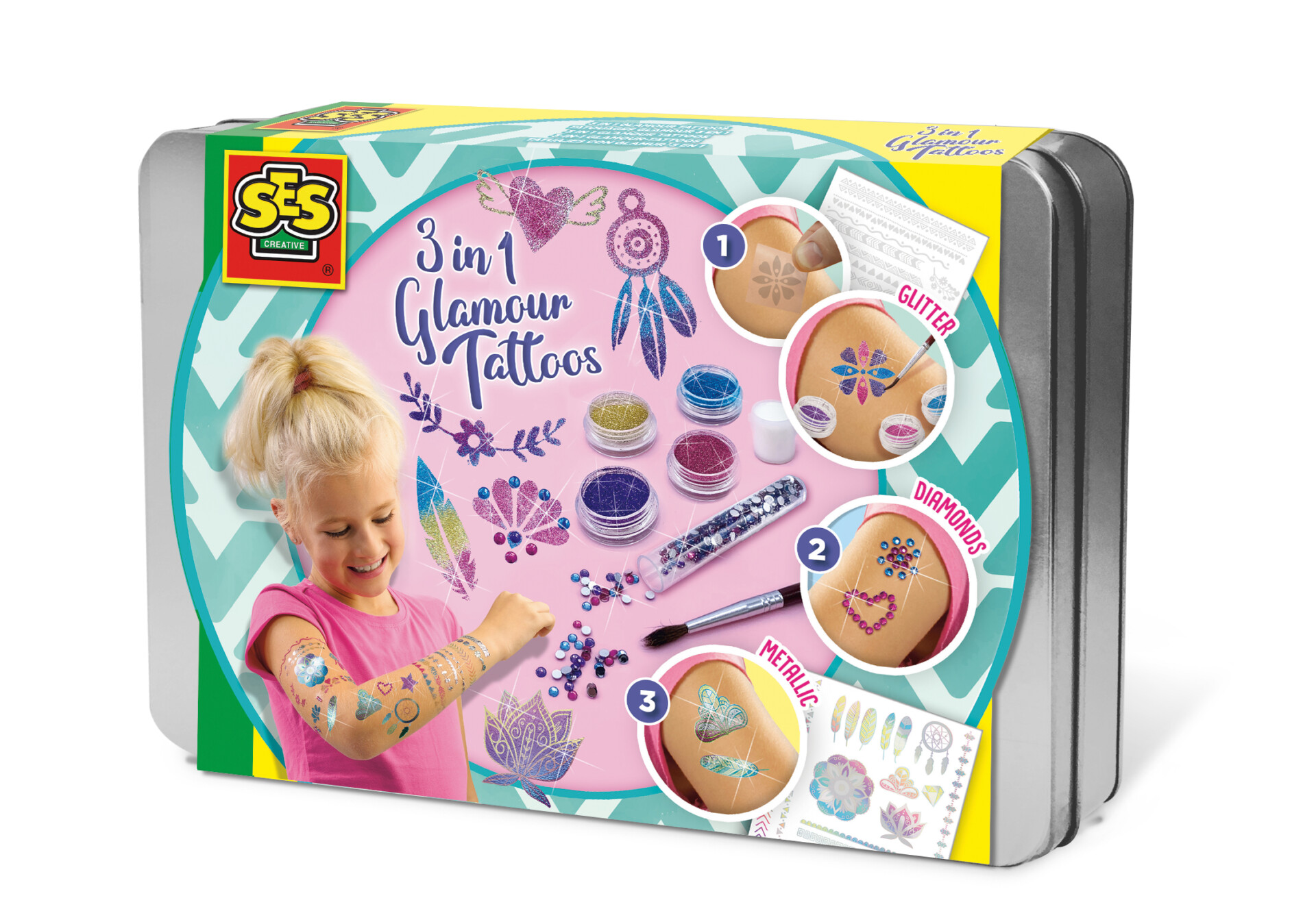 Met deze luxe 3 in 1 beauty set van SES Creative versier je jezelf met de mooiste fashion tattoos. Deze set bevat prachtige metallic tattoos, transparante sticker tattoos waar je zelf verschillende helder gekleurde glitters in kan strooien en een speciale huidlijm. Met deze lijm kun je je naam of eigen tekening maken op je huid en hem instrooien met de glitters of beplakken met de luxe diamantjes. Zo zie je er in no-time feestelijk uit! Cosmetisch getest en makkelijk afwasbaar van de huid.